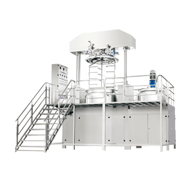 高剪切乳化機(jī)的物料微?;?、乳化、混合、調(diào)勻、分散等可于短時(shí)間內(nèi)完成。鍋內(nèi)物料通過均質(zhì)機(jī)的高速內(nèi)循環(huán)剪切混合乳化,相向雙攪拌,順時(shí)針框式刮壁攪拌,逆時(shí)針漿式攪拌,刮板攪拌器在運(yùn)轉(zhuǎn)時(shí)產(chǎn)生離心作用,使四氟刮板緊貼鍋壁,有效的解決了鍋壁沾料問題,不留死角,理想的變頻調(diào)速裝置可使其轉(zhuǎn)速任意無級(jí)調(diào)速。